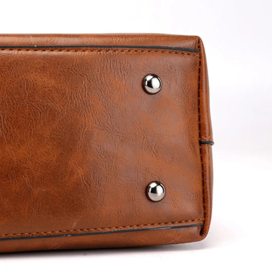 A refined everyday tote crafted from smooth caramel-tone PU leather, featuring top handles, a slim back zipper pocket, and front panel pockets for effortless organisation. Its structured form keeps the bag upright and polished, making it ideal for commuting, shopping, or casual styling.
