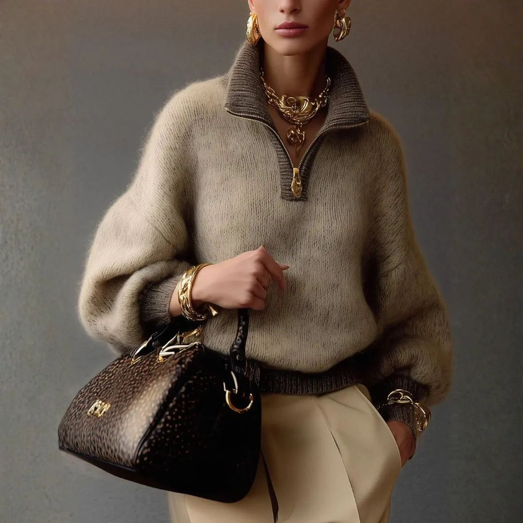 Women’s Two-Tone Ribbed Mock-Neck Zip Sweater